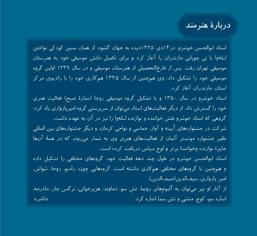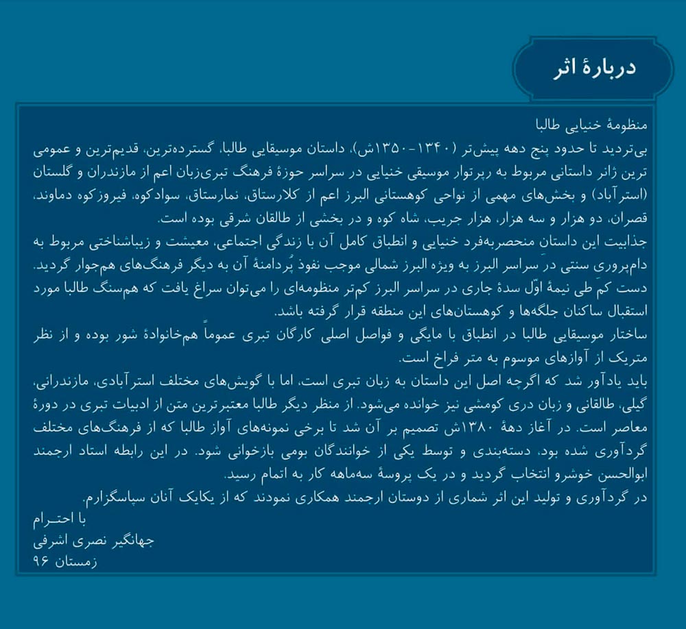«طالبا» نام یکی از مهمترین داستانهای موسیقی روایی و خنایی گستره جغرافیایی فرهنگ مازندران است. در این آلبوم روایتهای مختلف طالبا، که در عین وحدت تفاوتهای ظریفی دارند اجرا شده است. جهانگیر نصری اشرفی پژوهنده این اثر بوده و کار دشوار اجرا را به یکی از اساتید بزرگ موسیقی مازندرانی یعنی ابوالحسن خوشرو سپرده است. خوشرو آواز خودش را با لـلهوا همراهی کرده است.