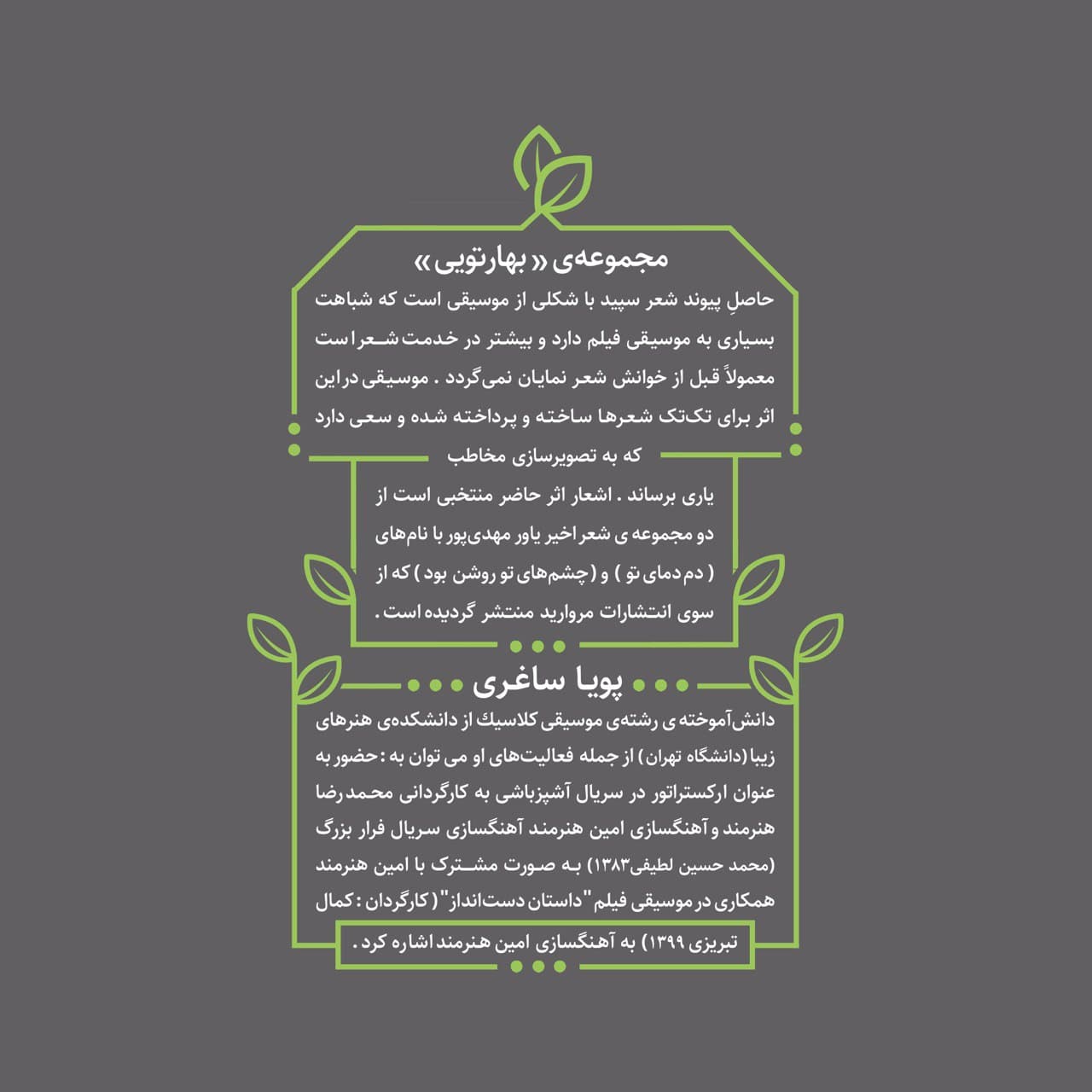 این کتاب صوتی در سبک شعر تلفیقی پاپ و شامل ۳۰ عدد قطعه موسیقی می باشد. که ترانه های آن توسط یاور مهدی پور سروده شده است.