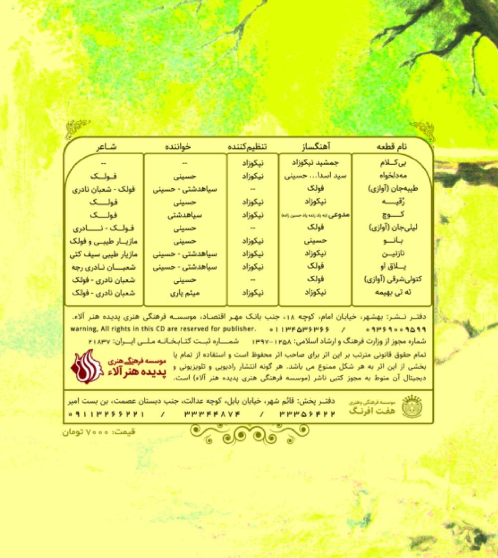 این آلبوم در سبک فولکلور می باشد که ترانه های آن توسط شعبان نادری رجه و مازیار طیبی سیف کتی سروده شده است.