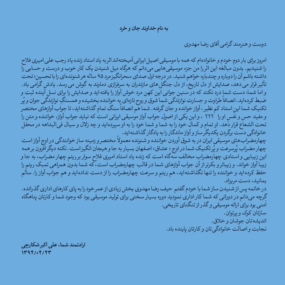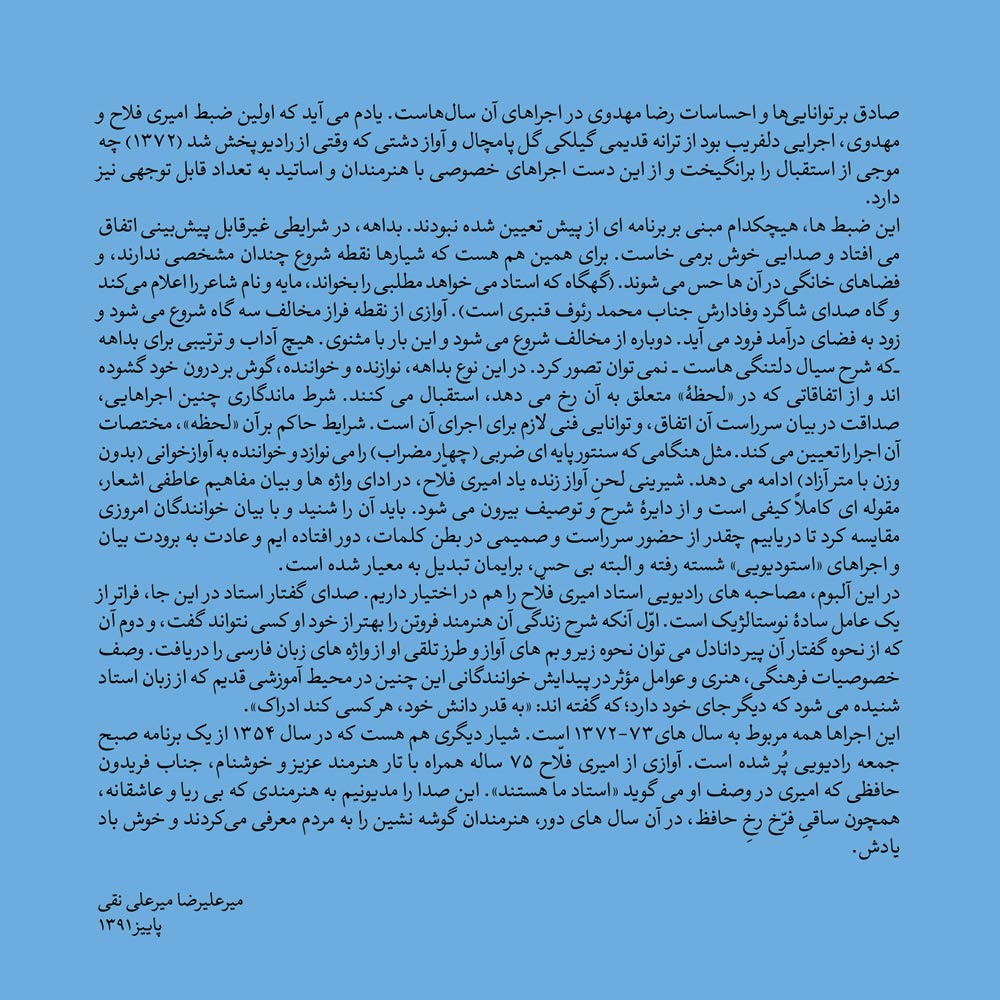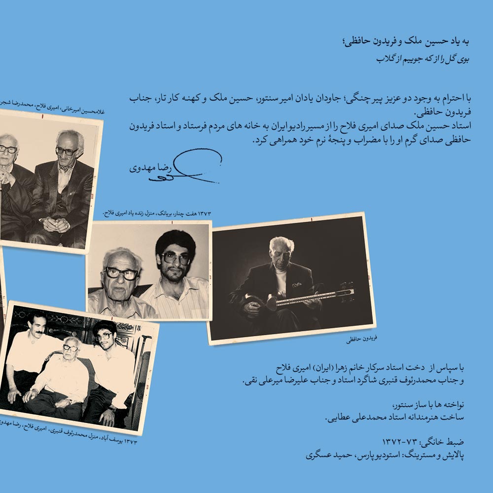 آلبوم امیر بحر آواز مجموعه‌‌ای است از اجراهای ضبط شده آواز رجب علی امیری فلاح با همراهی سنتور رضا مهدوی. این اجراها همه مربوط به سال‌های 1372 تا 73 می‌شوند، به اضافه اجرایی از سال 1354 از یک برنامه رادیویی که آوازی است از امیری فلاح 75 ساله با تار هنرمند خوشنام، فریدون حافظی. میرعلیرضا میرعلی‌نقی درباره این آلبوم می‌گوید : «روش خوانندگی امیری فلاح آمیزه‌ای گوارا از خوانندگان قدیم، رنگ‌گرفته از احوالات لطیف درونش بود و در همصدایی با مضراب‌های جوان رضا مهدوی ترکیبی را می‌آفرید که توصیف آن آسان نیست.»
