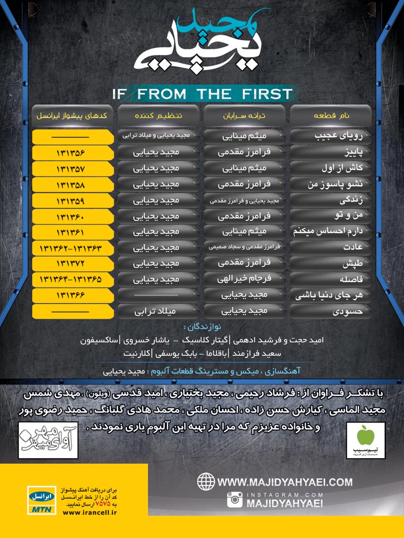 تبریک میگم سیار آلبوم دلنشین و زیبایی بود پیشنهاد میکنم به هیج وجه این البومو از دست ندید...مجید جان موفق باشی