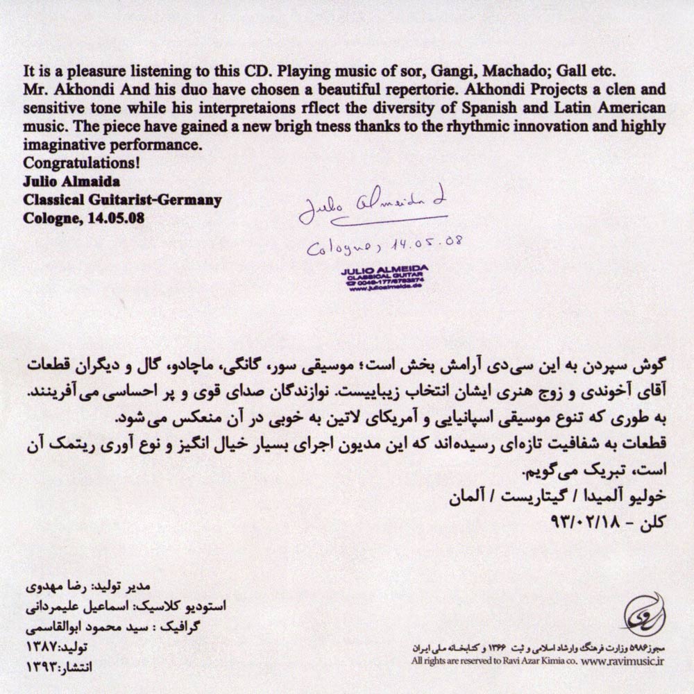 «خولیو آلمیدا» گیتاریست معروف آلمانی در بروشور این اثر آورده است: «گوش سپردن به این سی دی آرامش بخش است. موسیقی سور، گانگی، ماچادو، گال و دیگران قطعات آقای آخوندی و زوج هنری ایشان انتخاب زیباییست. نوازندگان صدای قوی و پر احساسی می آفرینند. بطوری که تنوع موسیقی اسپانیایی و آمریکای لاتین به خوبی در آن منعکس می شود. قطعات به شفافیت تازه ای رسیده اند که این مدیون اجرای بسیار خیال انگیز و نوع آوری ریتمیک آن است؛ تبریک می گویم».
