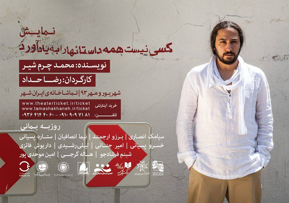 نمایش «کسی نیست این داستانها را به یادآورد» نوشته محمد چرمشیر و کار رضا حداد از روز 23 شهریور ماه سال جاری اجرای خود را در تالار استاد سمندریان تماشاخانه ایرانشهر آغاز میکند.