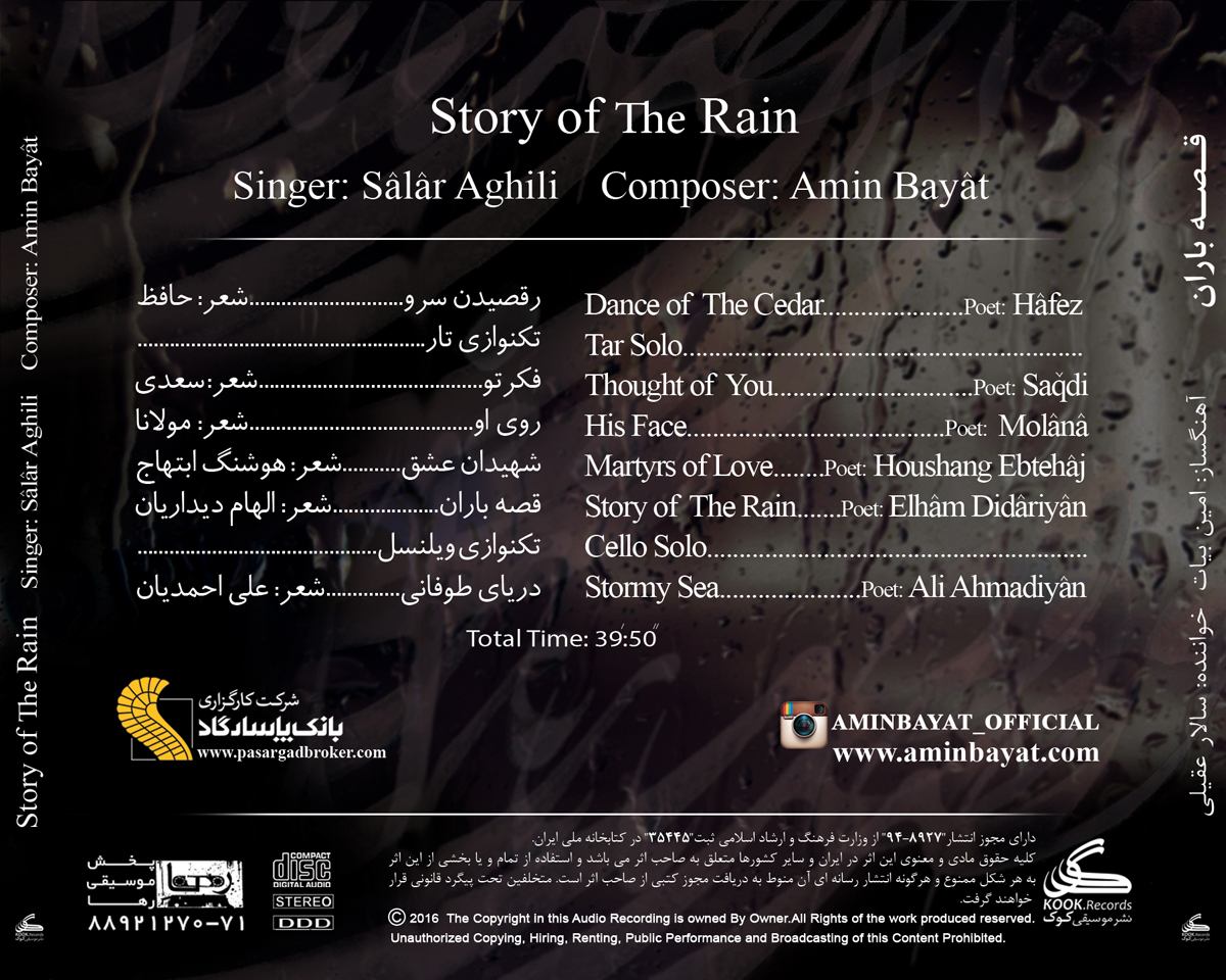 به گزارش «موسیقی ما»، آلبوم «قصه باران» با صدای سالار عقیلی و آهنگسازی «امین بیات» فردا (دوشنبه 12 بهمن) در بازار موسیقی کشور منتشر خواهد شد تا این خواننده پس از یک هفته پر خبر، شاهد انتشار اثر جدیدش باشد.