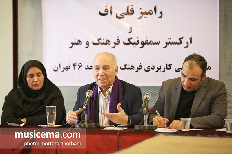 به گزاش «موسیقیما»، در این نشست رامیز قلی اف نوازنده تار از کشور آذربایجان، سوسن تقی پور رئیس دانشگاه علمی کاربردی فرهنگ هنر واحد 46، شهرام توکلی رهبر ارکستر، علی اکبر قربانی رهبر ارکستر و رشید وطن دوست خوانندهی ارکستر، حضور داشتند. «رامیز قلیاف» در ابتدای این نشست خبری گفت: «بسیار خوشحالم که بار دیگر میتوانم در تالار وحدت به عنوان یکی از تالارهای بسیار زیبای اجرای موسیقی برنامه ای را اجرا کنم. من در زندگی هنری ام کنسرت های زیادی را در کشورهای مختلف برگزار کردم اما این کنسرت از اهمیت بسیار زیادی برایم برخوردار است. این اجرا به نظرم دربرگیرنده اتفاقات بسیار خوبی است که در آن موسیقی کلاسیک، موسیقی مقامی، موسیقی آذربایجانی و موسیقی ایرانی در کنار هم به مخاطب ارائه خواهد شد.» سوسن تقی پور رئیس دانشگاه علمی کاربردی فرهنگ و هنر واحد 46: ارکستر سمفونیک فرهنگ و هنر در سال 1393 در مرکز علمی کاربردی فرهنگ و هنر واحد 46 افتتاح شد. این ارکستر تلفیقی از دانشجویان و فارغ التحصیلان رشته موسیقی است. اجراهای موفقی در تالار وحدت داشته ایم. اجرا به دعوت کنسرواتوار چایکفسکی در سالن راخ مارینوف در روسیه را داشته ایم. سمفونی افلاکیان را تهیه و اجرا کردیم که اجراهایمان در سالن موزه دفاع مقدس روی صحنه رفت. اجرای پیش رو را در خدمت استاد رامیز قلی اف هستیم. روز 30 آذر 1396 مصادف با شب یلدا و روز اول دی در دوسانس اجراهایمان روی صحنه می رود. این نکته را هم بگویم که ما رشته های دیگری در دانشگاه واحد 46 داریم و اکنون بیشتر دانشجویان ما در رشته های مختلف به طور حرفه ای مشغول فعالیت هستند.