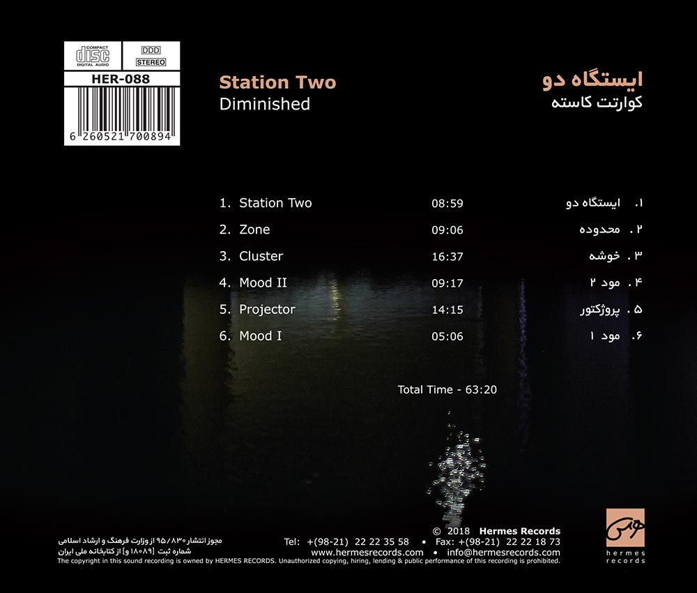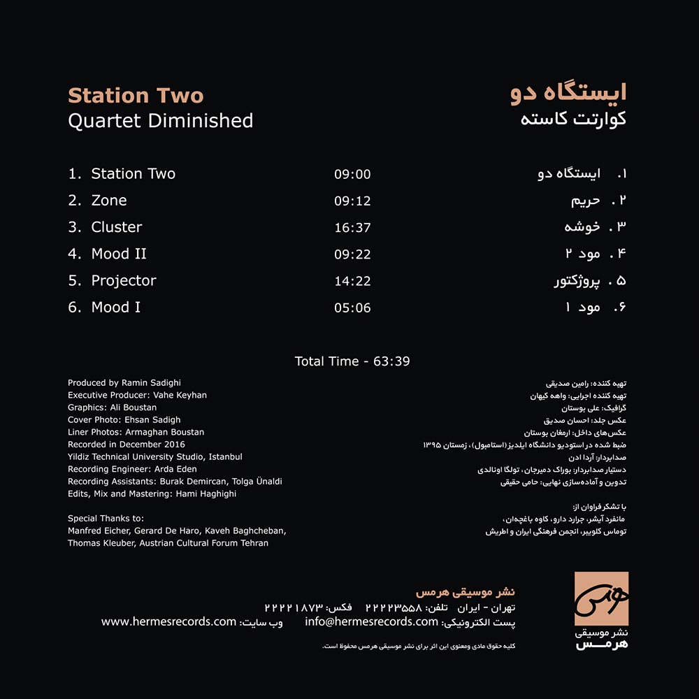ایستگاه دو دومین آلبوم گروه کوارتت کاسته پس از آلبوم ایستگاه یک است. کوارتت کاسته گروهی متشکل از احسان صدیق (گیتار الکتریک)، مازیار یونسی (پیانو، آوا)، سهیل پیغمبری (کلارینت، کلارینت باس، ساکسیفون سوپرانو) و روزبه فدوی (درامز) است. موسیقی کوارتت کاسته برخوردی میان ژانری در موسیقی است، سبکهای جز، بلوز، راک و حتی پاپ در بستری مدرن با گوشههایی از بداهه نوازی در هم ترکیب شدهاند و حاصل آن شش قطعه در آلبوم ایستگاه دو شده است.