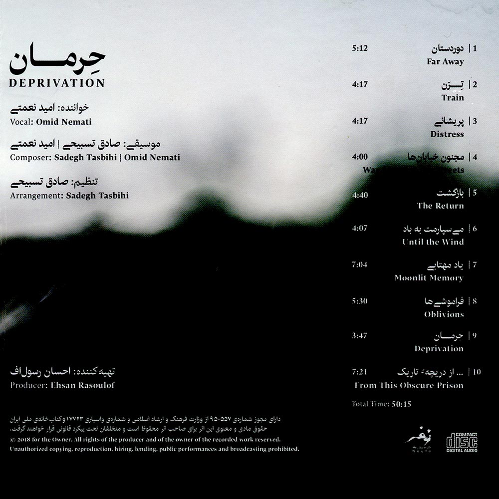 آلبوم حرمان اولین اثر رسمی و مستقل امید نعمتی خواننده گروه پالت است. این آلبوم شامل ده قطعه به آهنگسازی و تنظیم صادق تسبیحی است. امید نعمتی به جز خوانندگی در نه قطعه، آهنگسازی برخی قطعات را نیز بر عهده داشته. آهنگهای حرمان در فضای موسیقی تلفیقی هستند. بعضی قطعات از سازبندی نظیر کوارتت زهی استفاده میکنند و برخی دیگر از ترکیب ساز و فضاسازی الکترونیک. اشعار آهنگها از آثار شاعرانی همچون هوشنگ ابتهاج، مهدی اخوان ثالث، رسول یونان، رهی معیری، حسین منزوی، حافظ، نادر نادرپور و حمید مصدق انتخاب شده. از نوازندگان آلبوم نیز میتوان نازنین احمدزاده، روزبه اسفندارمز، کوروش بابایی، بهزاد حسن زاده، علی ضرابی، مهیار طهماسبی، دارا دارایی و داریوش آذر را نام برد.
